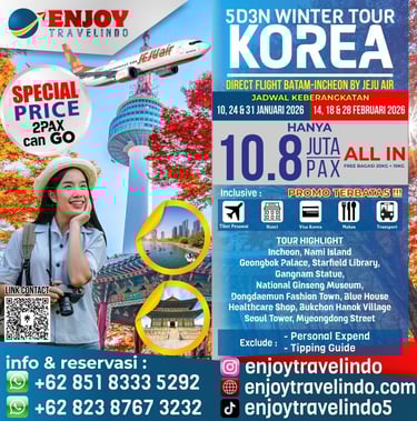 Paket Tour Korea ini merupakan Paket Liburan paling viral saat ini, karena dapat mengunjungi Negeri Ginseng yang eksotis dengan biaya super hemat. Paket ini dimulai dari Batam dengan penerbangan tegah malam, sehingga bagi kamu yang tinggal diluar Batam seperti Medan, Padang, Pekanbaru, Bangka Jambi atau Palembang dapat berangkat last flight dari kota masing-masing tanpa harus pesan hotel terlebih dahulu, sehingga kamu bisa langsung berkumpul di Bandara Hang Nadim Batam. Adapun harga paket dan jadwalnya adalah sebagai berikut:
